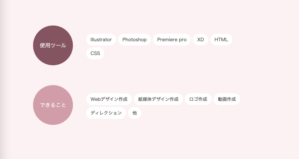詳しくは制作実績ページで確認できるようにしていますが、ぱっと見で私という人はどんなツールを使って何ができるのかが伝わるように簡潔にまとめています。